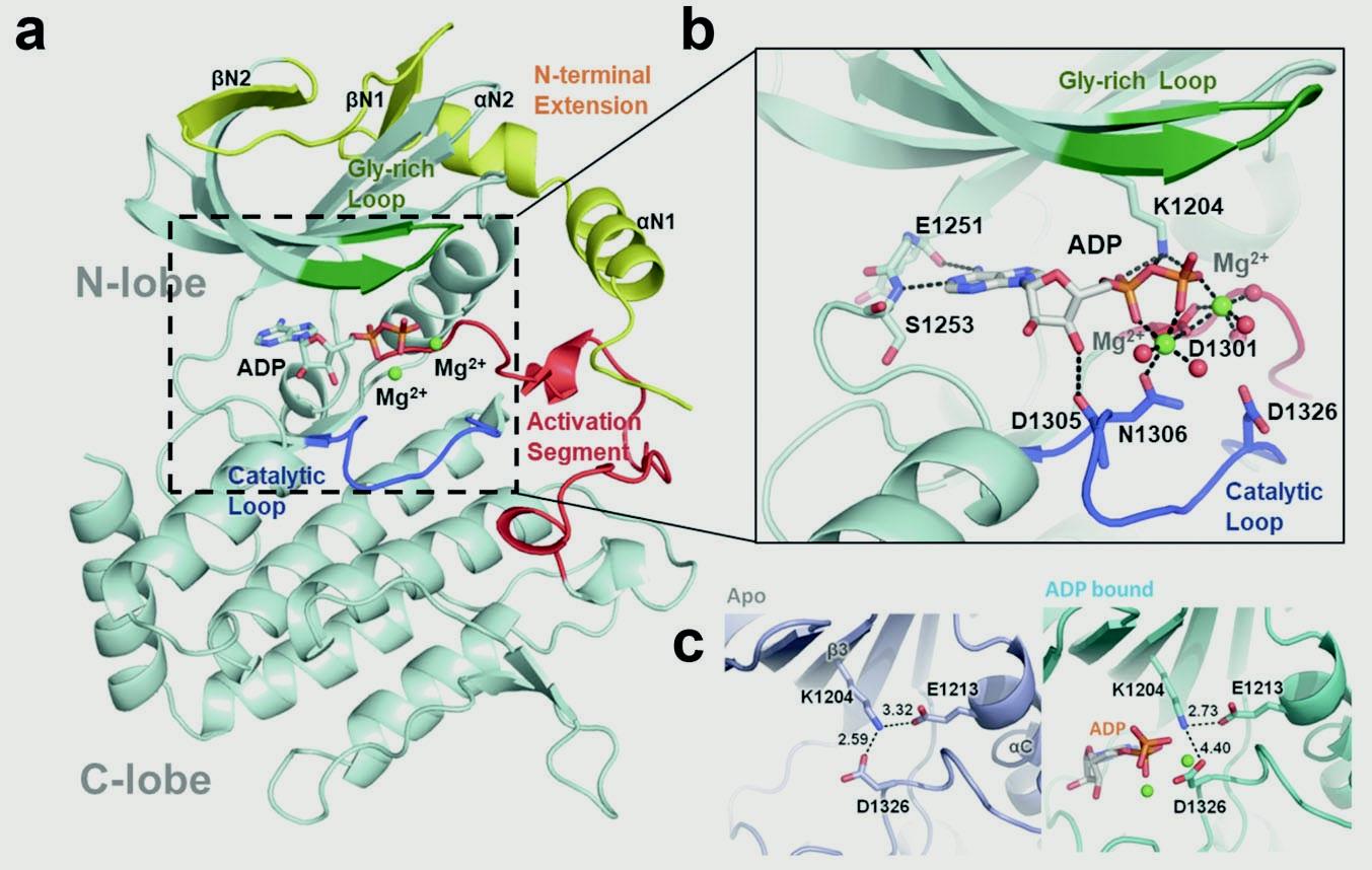 细胞是生命活动的最小单元,细胞器是真核细胞执行复杂生命活动调控的“工作室”。细胞器分为膜性细胞器与无膜细胞器。着丝粒是一个典型的无膜细胞器,其在细胞有丝分裂过程中扮演不可缺少的作用,其组装与功能异常导致染色体丢失、易位等,从而使细胞生长失控,如癌症。美国Bert Vogelstein团队在上一个世纪90年代发现了着丝粒BubR1基因突变对在直肠癌基因组不稳定性的影响。此后, BubR1基因突变增加胃癌易感性的案例也相继报道。针对BubR1是否是蛋白激酶这一关键科学问题及其构-效关联的生物学意义,中国科学技术大学姚雪彪、滕脉坤、臧建业、刘行与上海生化与细胞所张荣光(科大7308校友)合作团队精诚合作,从2012年开始联手对有丝分裂重要蛋白激酶BubR1进行结构生物学研究。经过对多个物种BubR1蛋白在不同条件下的筛选与优化,成功地解析了果蝇BubR1蛋白的晶体结构(图一)。从X-线衍射数据分析得到的卡通模型结构表示:BubR1具有蛋白激酶的经典特征:一系列反平行β-折叠和一个α-螺旋形成的N端lobe;一个主要由螺旋结构组成的C端lobe。从晶体结构中我们分析得出两个lobe之间有个ATP的结合口袋。从激酶与构效研究结果提示,Lys1204、Asp1326和Ser1253这三个位点可与ATP形成氢键,对于稳定ATP与BubR1激酶区域结合口袋的结合非常重要,是BubR1催化底物磷酸化的结构基础(图一)。