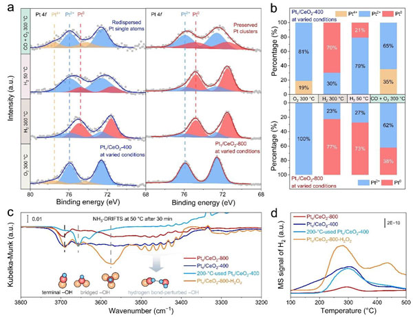 一系列的原位表征证明高温煅烧的催化剂在一氧化碳氧化的条件下体现出抗氧化性,负载的铂维持了团簇特征,而低温煅烧的催化剂在反应条件下再分散为单原子,表现出正价态(图2)。催化剂的表面羟基被证明在再分散的过程中起到关键作用,高温煅烧抑制了催化剂表面羟基的产生,进而促使铂在氧化气氛下维持团簇结构。工况下的原位表征证明在氧化还原的过程中,高温煅烧的催化剂不仅可以产生更多的表面三价铈,而且体现出更高的三价铈生成速率以及更低的活化能,表明高温煅烧不仅有利于维持催化剂的团簇结构,而且会提升催化剂表面的氧化还原能力,进而提升催化活性。